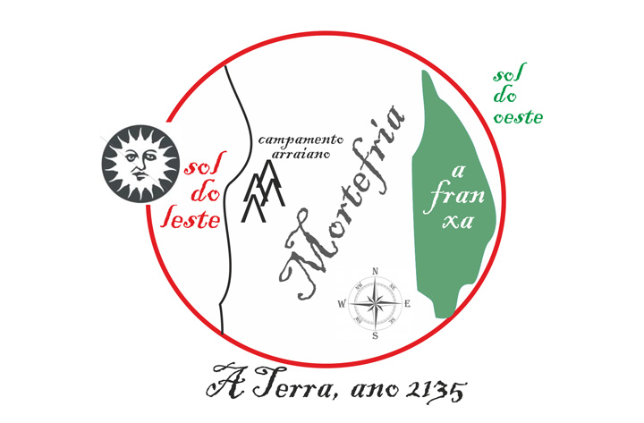 Onte chegamos ao lugar onde meus avós se inmolaron por nós. Corenta anos despois, tras unha volta completa ao planeta neste eterno éxodo pola erma terra estamos de novo aquí no val dos cinco outeiros onde se fundou o pobo arraiano. Hai corenta anos meus avós extenuados xaceron ao pé deste outeiro agardando o despiadado sol nacente pero antes sementaron o xerme da disidencia entre os patibularios máis xoves. Comináronlles a loitar pola súa vida, a adaptarse para sobrevivir nesta árida e indómita terra coa permanente ameaza do sol do leste. Conseguírono e agora somos máis fortes.