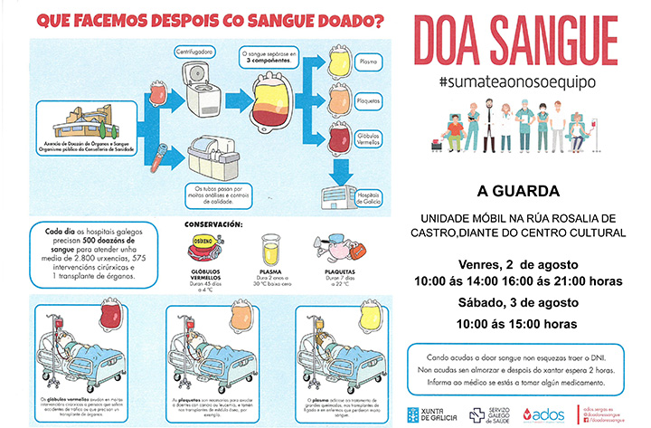 A unidade móbil do Centro de Transfusión de Galicia estará instalada na Guarda o venres día 2 e sábado día 3 de agosto.