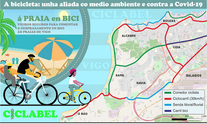 A agrupación Vigo Ciclabel da que Ecoloxistas en Acción Vigo é integrante xunto coas asociacións A Golpe de Pedal, ConBici, Verdegaia, ADEGA, Greenpeace, Mulleres Bicivisibeis, Vigo Histórico e Xuventude polo Clima lanzamos unha campaña para fomentar durante o verán o uso da bicicleta como medio de transporte nos desprazamentos ás praias de Vigo. Para que esta ciclo-mobilidade sexa unha realidade propoñemos ao Concello de Vigo que implemente corredores ciclistas na avenida de Europa, na avenida de Samil e na avenida de Beiramar, dedicando un carril de ida e outro de volta á mobilidade exclusivamente en bicicleta e ciclocarrís mixtos na rúa Tomás Alonso, rúa Camilo Veiga, avenida da Atlántida, avenida da Florida, rúa de Tomás Paredes, rúa do Río e rúa de Canido, mediante a redución da velocidade máxima a 30km/h en todos os traxectos e a colocación de lombos na calzada como medida de pacificación do tráfico rodado a motor.