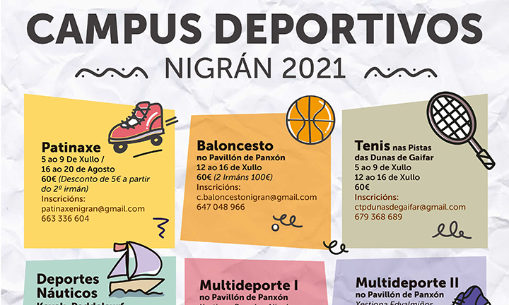 O Concello de Nigrán, coa colaboración dos clubes do municipio, organiza dende finais de xuño a inicios de setembro dez campus deportivos orientados a crianzas e adolescentes: patinaxe, baloncesto, tenis, deportes náuticos, multideporte, tenis de mesa, fútbol e ximnasia rítmica. O prazo de inscrición aos mesmos está aberto, dispondo os interesados de toda a información na web municipal (datas, mails de contacto e teléfonos, lugar de celebración, prezo, etc). Todos teñen unha duración aproximada de cinco días e un custe entre os 45 € e os 65 €, existindo nalgúns casos descontos para irmáns. Os campus están orientados a un público infantil e adolescente e arrancan con deportes náuticos o 28 de xuño, sendo o último o de surf do 30 de agosto ao 3 de setembro. O Concello aportará a merenda diaria para cada participante e a cobertura do seguro.