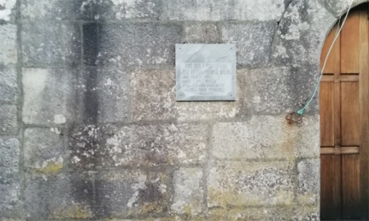 SÍ TEN. En Forma de placa de mármore na súa parede Sur. É a única igrexa do concello que non está en forma de baixorrelevo.