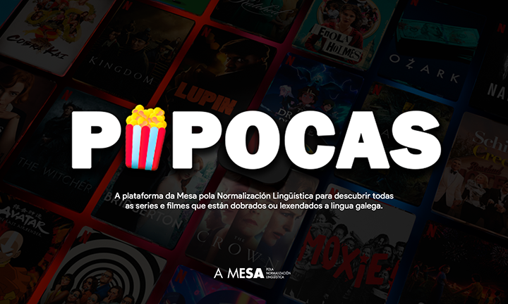 A Mesa pola Normalización Lingüística lanzou esta mañá Pipocas, un catálogo web que recolle todos os filmes e series dobradas ou lexendadas á nosa lingua e que redirixe o público ás plataformas na que está cada título. No momento do seu lanzamento, o catálogo recolle máis de 100 títulos. Dende a entidade asegúrase que será actualizado de xeito permanente e solicítase que o público contacte para advertir da ausencia de calquera filme ou serie.