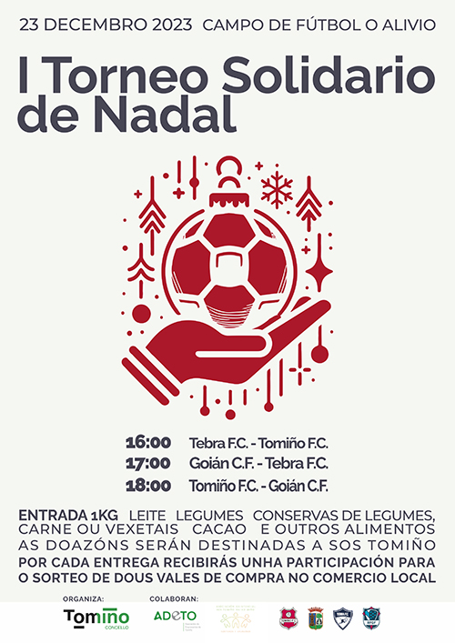 Tomiño seguirá a celebrar as festas pensando nas persoas máis desfavorecidas cunha xornada de deporte e solidariedade. O Concello organiza o vindeiro 23 de decembro o I Torneo Solidario de Nadal, unha iniciativa que busca unir á veciñanza arredor do deporte e de valores como a solidariedade, promovendo o espírito de colaboración e apoio mutuo.