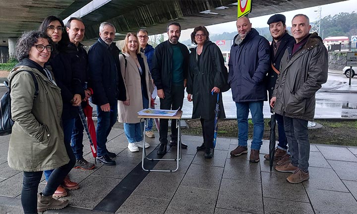 Mos, 28 de decembro de 2023. A senadora do BNG, Carme Da Silva, visitou esta mañá a zona de Angustias-Costilleta en Sanguiñeda (Mos) acompañada de concelleiros de Mos e Porriño, responsábeis locais e comarcais do Condado e Vigo, para poñer de manifesto os problemas de tráfico que rexistra a zona debido á confluencia de varias autovías e estradas sen os pertinentes accesos e a concentración de áreas comerciais que non foron precedidas dunha axeitada planificación viaria.