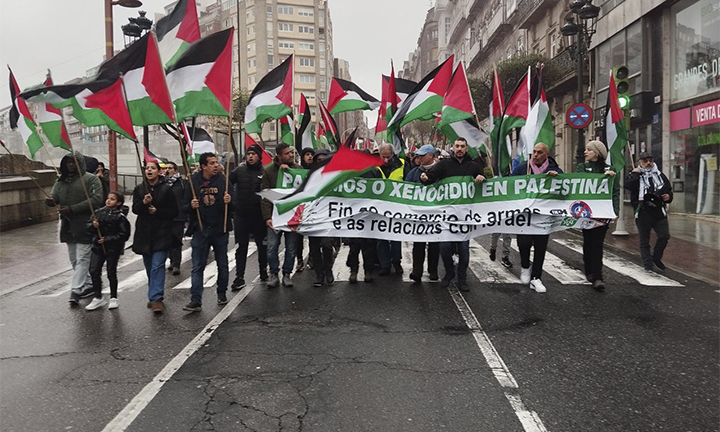 Na manifestación que percorreu as rúas de Vigo, os seus participantes esixiron ás institucións impulsar a campaña de Boicot, Desinvestimentos e Sancións (BDS), que busca rexeitar a normalización das políticas de apartheid israelís e exercer presión para facer insostible un réxime de ocupación ilegal, colonialismo e apartheid.