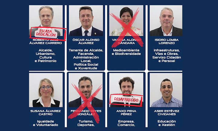 A primeira en saltar do barco foi Vanesa Alonso, veterinaria de profesión e que ocupaba o cargo de Concelleira de Medio Ambiente. Máis recentemente, tamén o fixo Fernando Reyes, piloto e Concelleiro de Turismo. Dúas dimisións en tan só ano e medio de mandato.