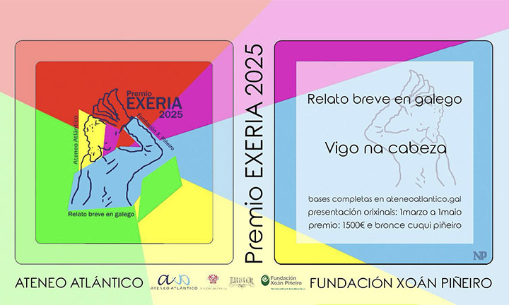 Outro ano máis o Ateneo Atlántico e a Fundación Xoán Piñeiro convocan o premio de relatos breves Exeria. Nesta 5ª convocatoria o lema de inspiración é “Vigo na cabeza”. Arredor desa idea debe xirar o relato, que poderá ser entregado ata o 1 de maio. É imprescindible que estea en galego, e sexa orixinal.