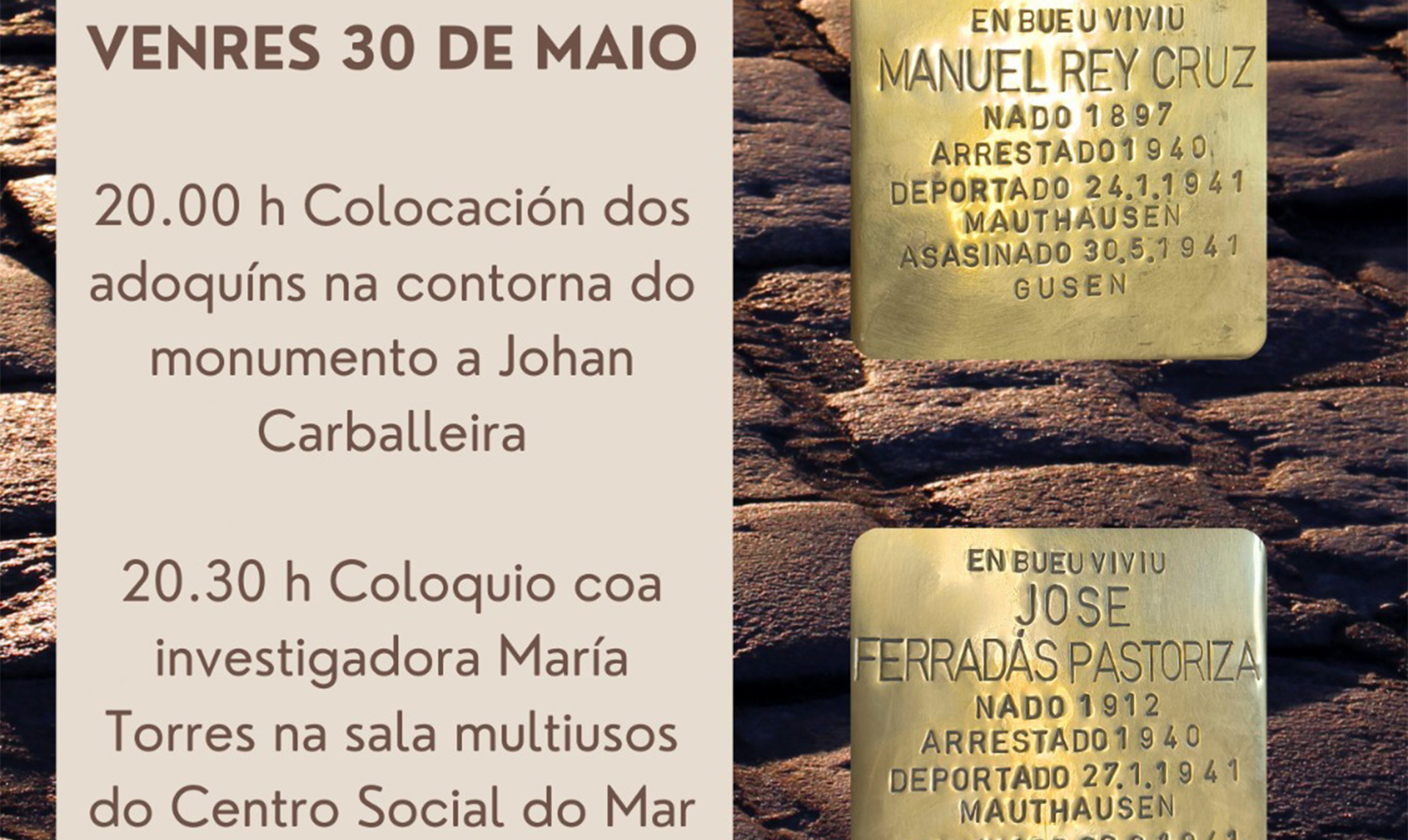 O Concello de Bueu e a Asociación de Amigos de Johan Carballeira colocarán este venres, 30 de maio, os ‘Stolpersteine’, ou adoquíns da memoria, a través dos que se lembrará aos dous veciños bueueses asasinados nos campos de concentración nazis, José Ferradás Pastoriza e Manuel Rey Cruz. O acto comezará ás 20 horas xunto ao monumento de Johan Carballeira, na Banda do Río, coa participación dos familiares dos asasinados, e despois seguiralle un coloquio na Sala Multiusos do Centro Social do Mar coa investigadora María Torres sobre a memoria dos campos de concentración nazis e, sobre todo, o paso dos galegos por eles.