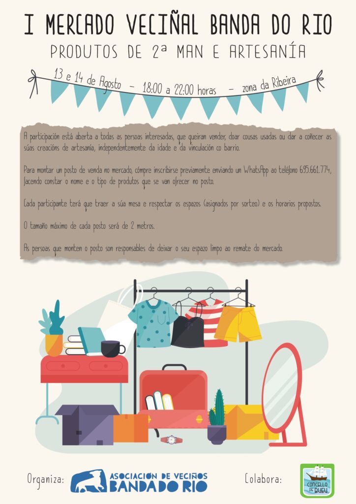 A Asociación Veciñal da Banda do Río, coa colaboración do Concello de Bueu, pon en marcha o I Mercado Veciñal da Banda do Río, que se celebrará o 13 e 14 de agosto con produtos de 2ª man e artesanais.