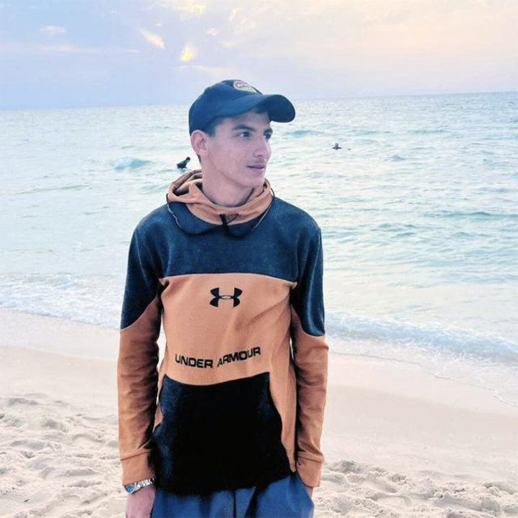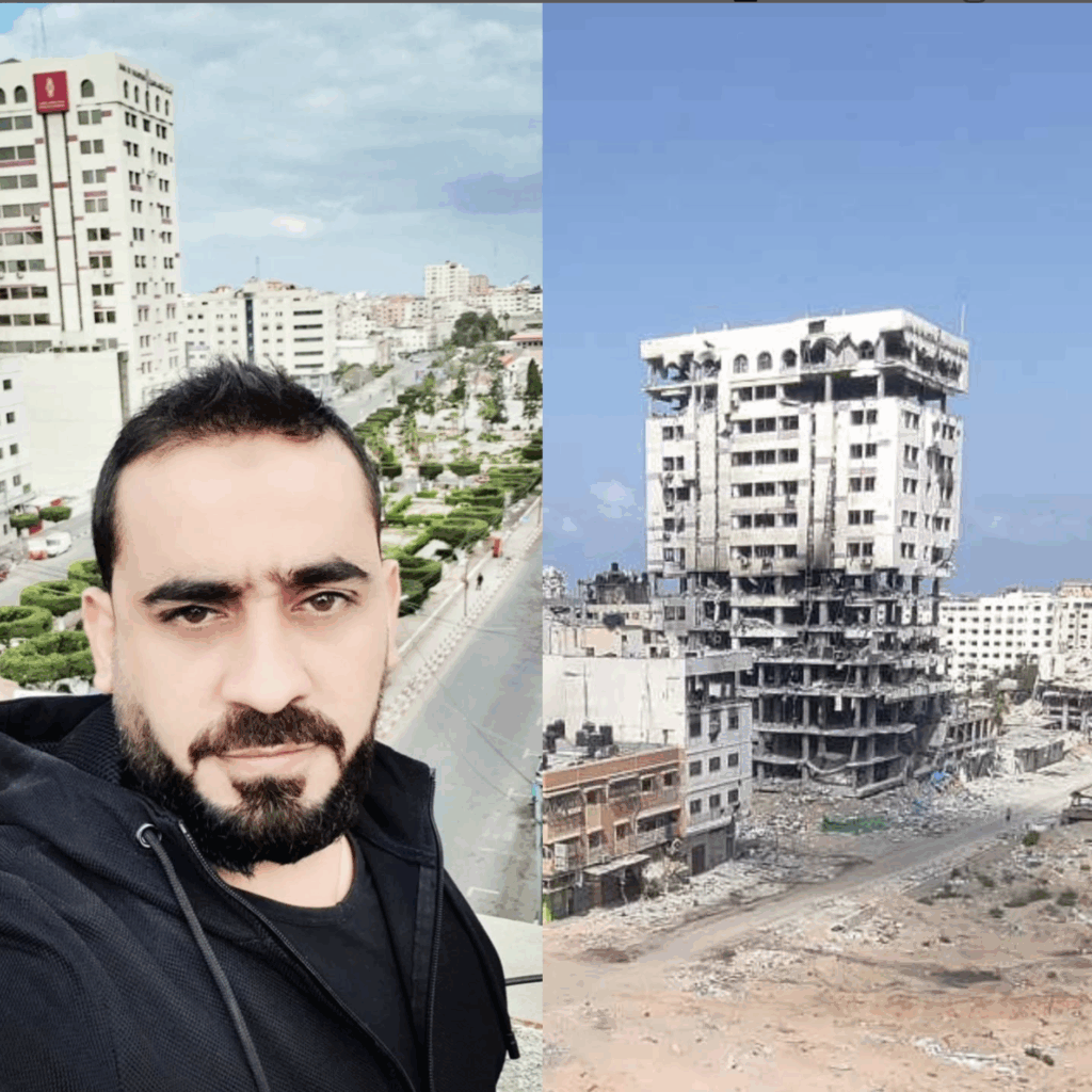 Belal ten 25 anos. Saíu de Gaza 1 mes antes de que todo comezase deixando atrás aos seus pais, irmáns e sobriños. Un total de 17 persoas sen contar tíos, tías e curmáns.