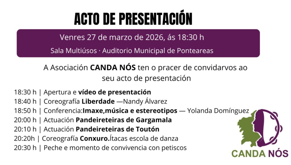 Arredor de 100 persoas acompañaron a asociación no seu acto de presentación no día de onte na sala multiusos de Auditorio de Ponteareas. Dita asociación sen ánimo de lucro inicia a súa andaina coa intención de por o seu gran de área na construcción dunha sociedade máis xusta a través do traballo no eido do benestar social e da igualdade. Este proxecto xurdiu coa idea de crear espazos de traballo e comunicación, realizar obradoiros, poner en valor o legado das mulleres ao longo da historia, levar a cabo actividades de sensibilización, conciencia e prevención.